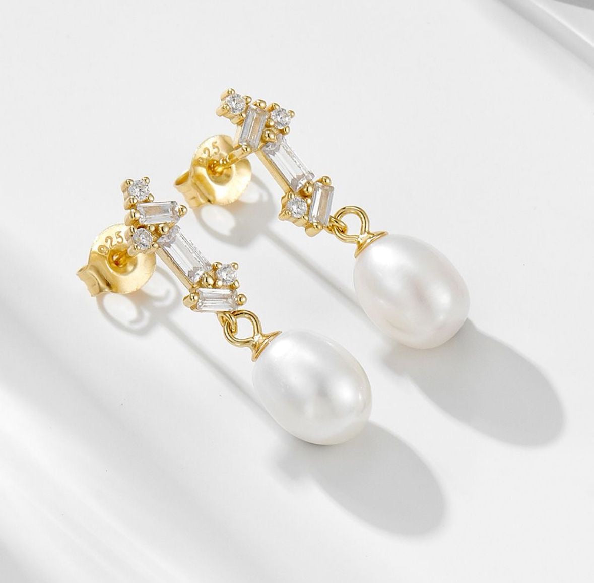 Elegant and sculptural, the Noelle Drops are a celebration of delicate form and radiant simplicity. A luminous natural pearl anchors the design, suspended beneath a fine baguette-cut zirconia that catches the light with every movement. With their graceful proportions and refined finish in 18k gold, these earrings bring quiet sophistication to both day and evening wear.